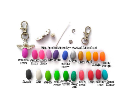 Het pakketje wordt geleverd met bovenstaande kralen en sieradenonderdelen. Desgewenst kun je zelf kralen in andere kleuren en afmetingen kiezen door deze los te bestellen.